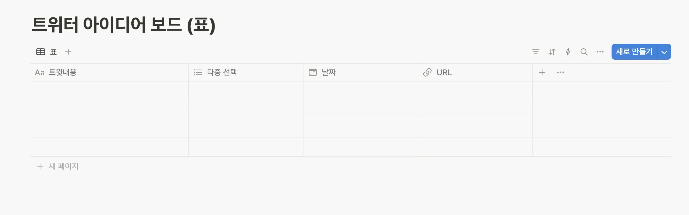 먼저 트윗을 저장할 Notion 데이터베이스(표)를 하나 만들어야 해요.